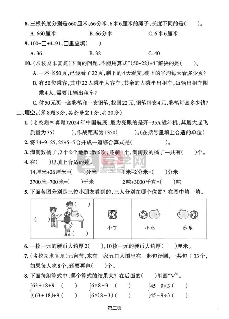25学年三上数学期中综合素养卷(人教版)含答案5页-喜学网