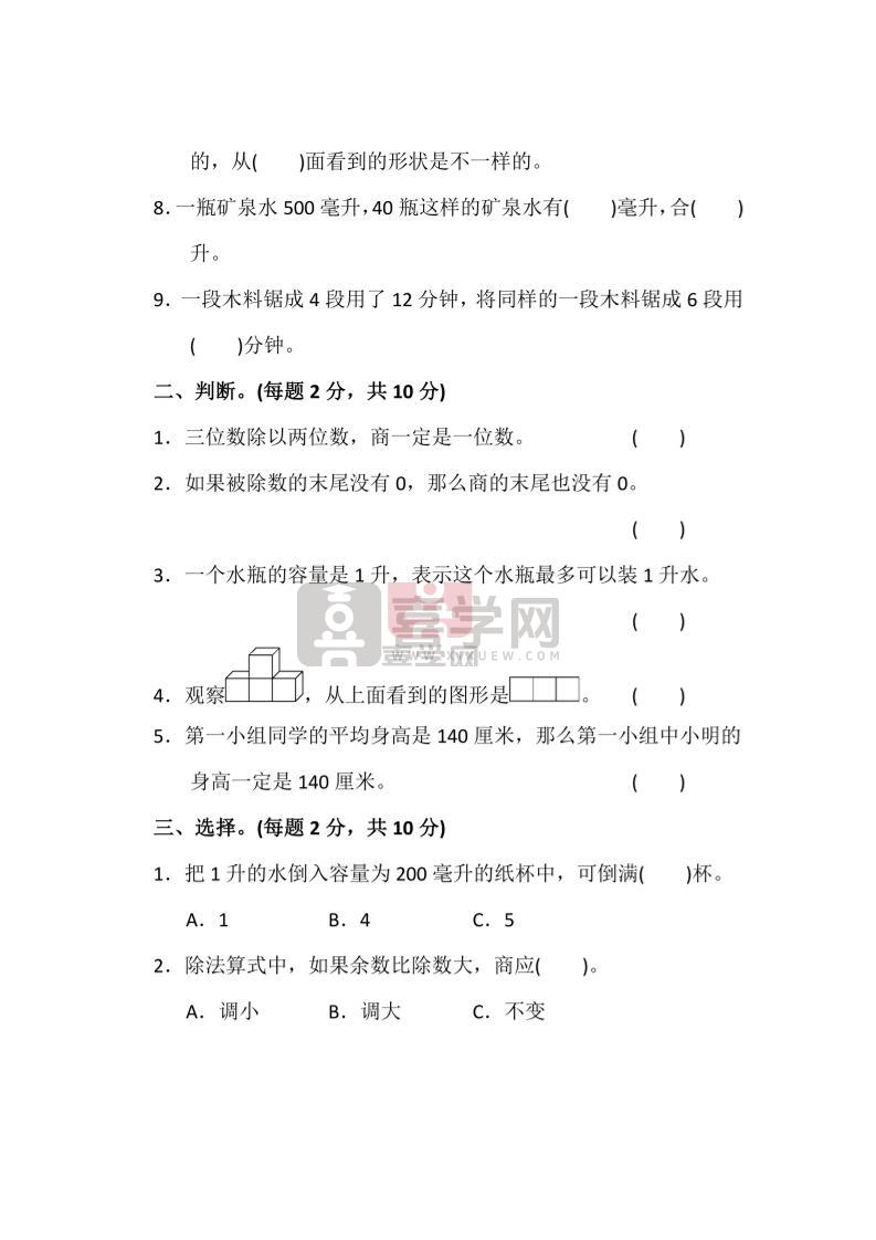 四上苏教版数学期中检测卷3-喜学网