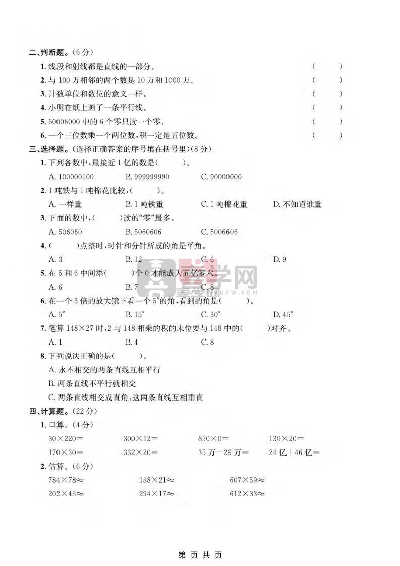 四年级上数学期中测试卷《青岛63版》-喜学网
