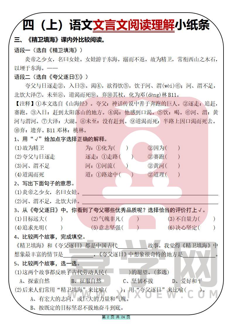四上语文文言文阅读理解小纸条31篇(含答案24页)
